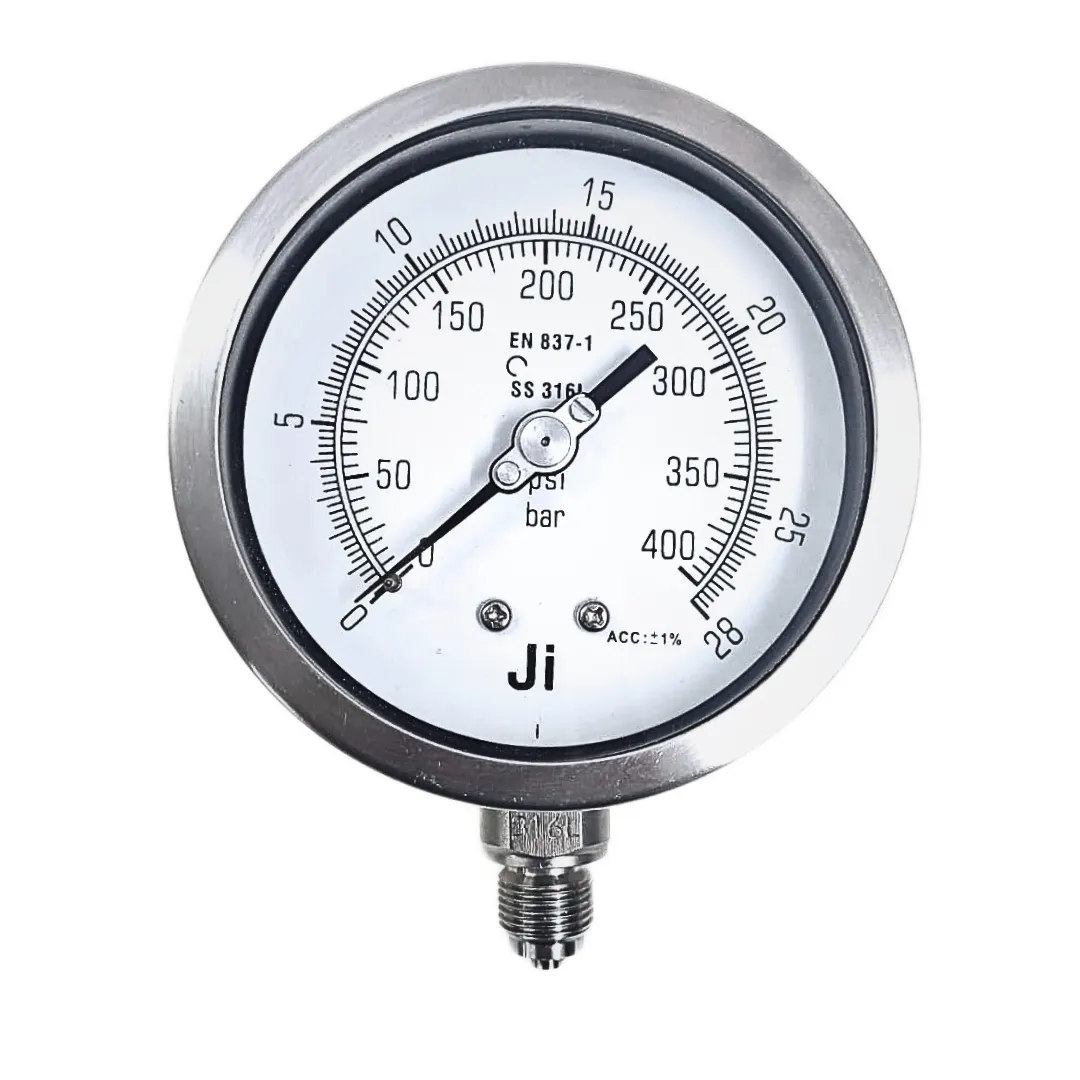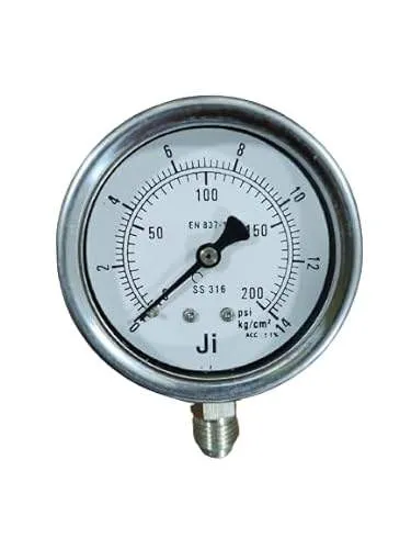 Industrial Glycerin Filled Pressure Gauge, Dial Size 2 1/2″ (63 mm), Stainless Steel 304 Case Bayonet Type & SS 316L Internals, Range 0 to 16 Bar with Dual Scale of 225 PSI, Direct Mounting Bottom Entry, Connection 1/4″ BSP (M), Accuracy 1% FSD