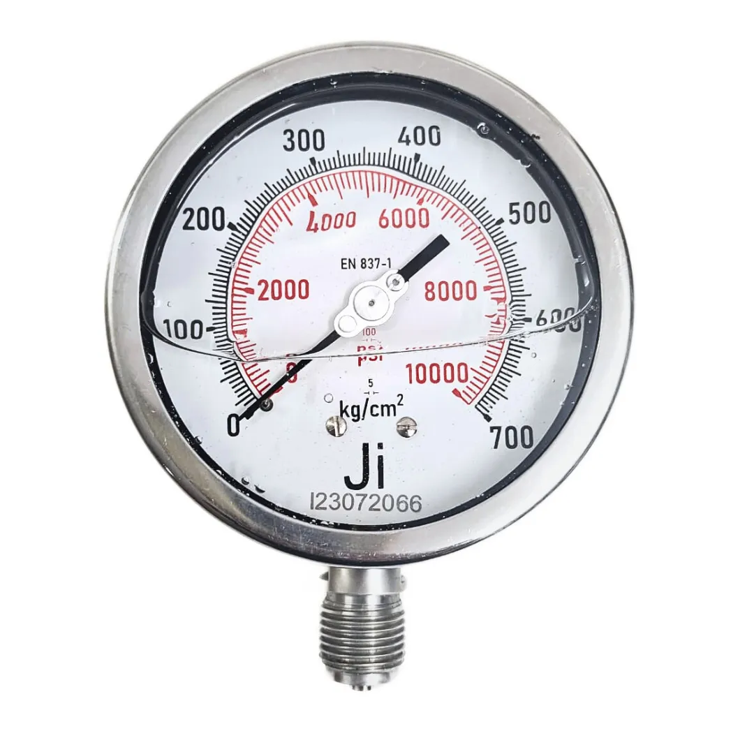 Industrial Pressure Gauge Glycerin Filled, 4″ (100 mm) Dial, Range 0 to 700 Kg/Cm2 with Dual Scale of 10000 PSI, Direct Mounting Bottom Entry, 1/2″ BSP (M) Connection, SS Case & SS Wetted Parts (Case Bayonet Type)