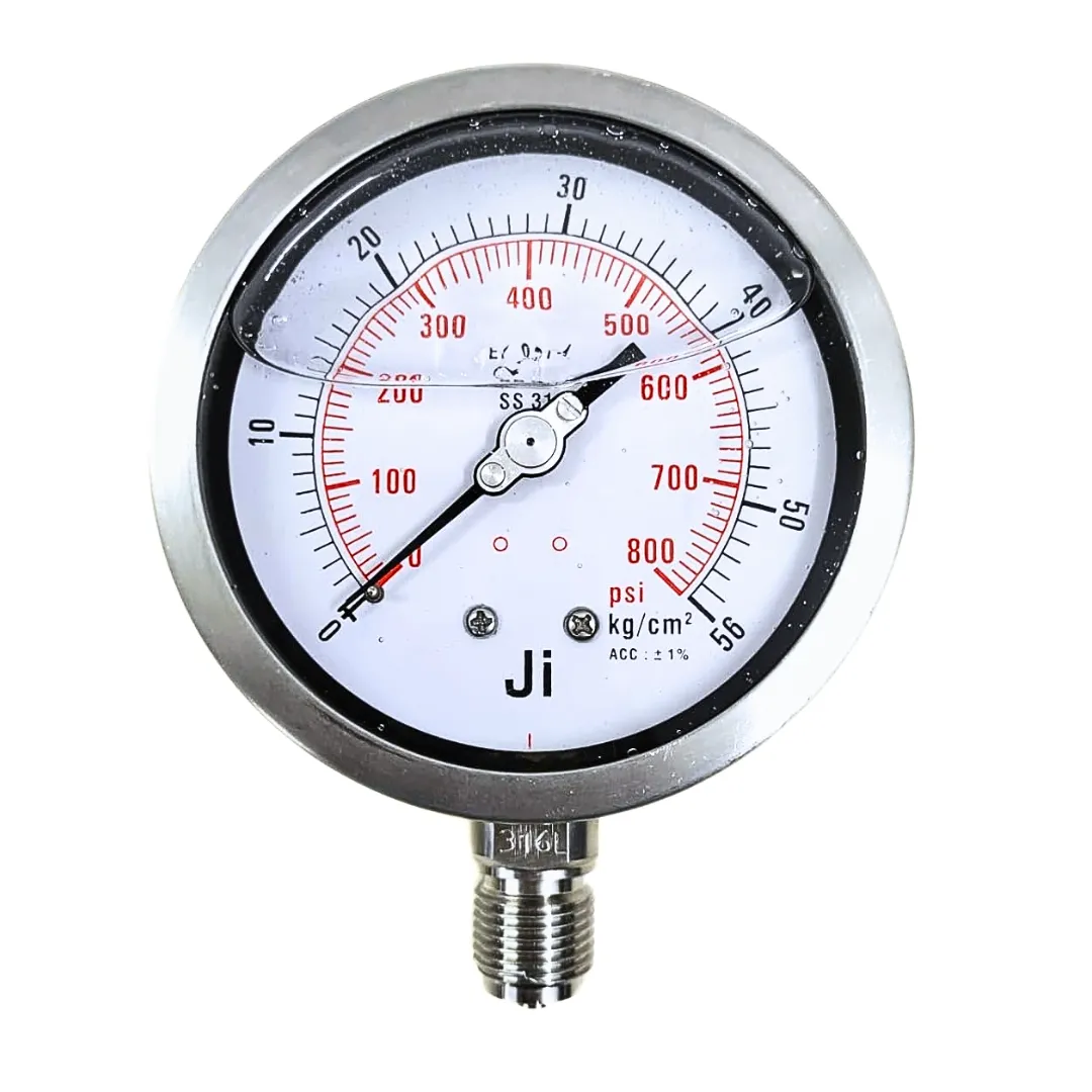Industrial Pressure Gauge Glycerin Filled, 4″ (100 mm) Dial, Range 0 to 56 Kg/Cm2 with Dual Scale of 800 PSI, Direct Mounting Bottom Entry, 1/2″ BSP (M) Connection, SS Case & SS Wetted Parts (Case Bayonet Type)