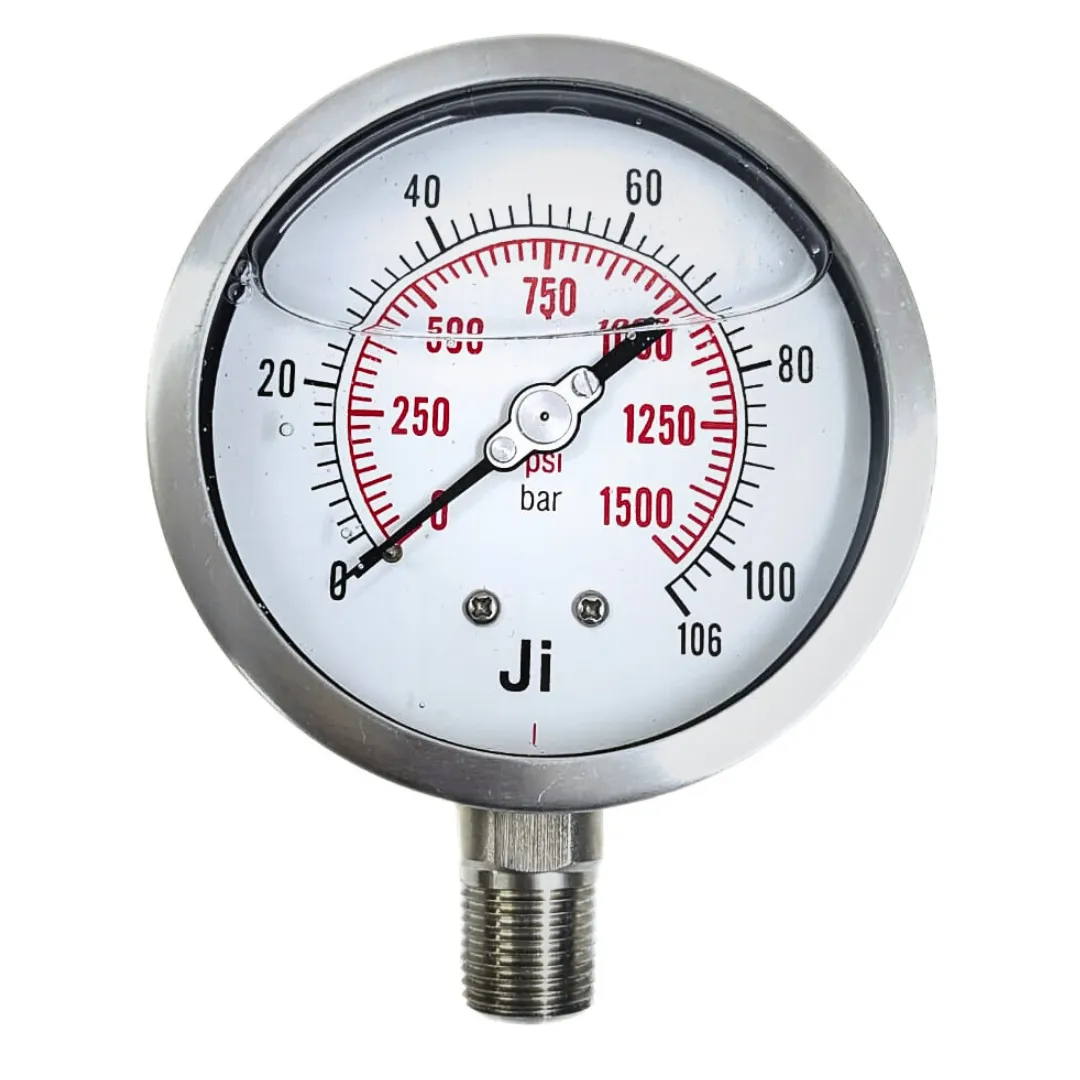 Industrial Pressure Gauge Glycerin Filled, 4″ (100 mm) Dial, Range 0 to 106 Bar with Dual Scale of 1500 PSI, Direct Mounting Bottom Entry, 1/2″ NPT (M) Connection, SS Case & SS Wetted Parts (Case Bayonet Type)